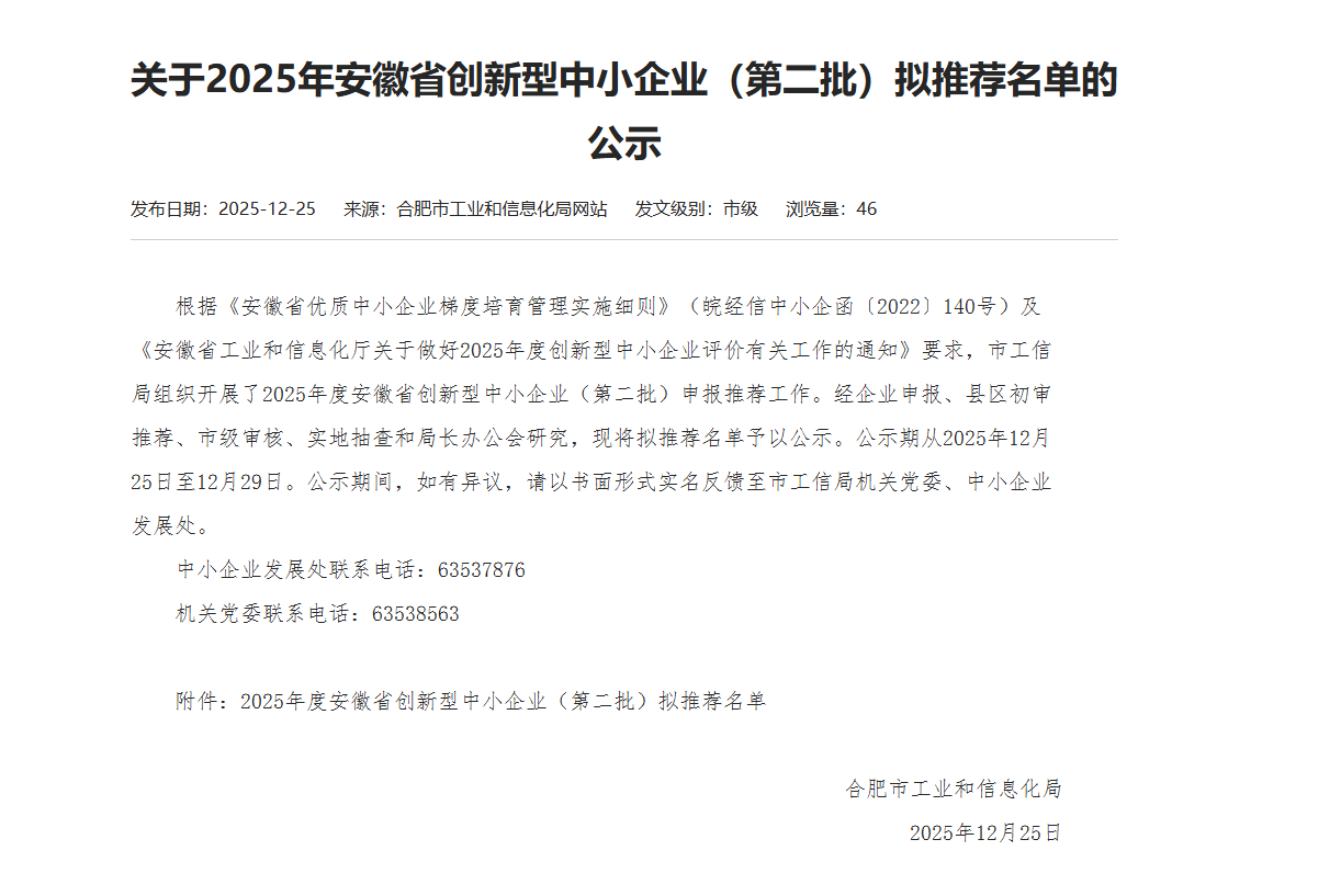 喜訊 | 祝賀我司榮獲2025年度安徽省“創(chuàng)新型中小企業(yè)”稱號(hào)